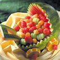 1. Almost any shape watermelon will work for this project. 2. Cut a thin slice from the bottom to provide a stable base. 3. Draw the outlines for the carriage as best you can to mirror the image. 4. Use a sharp knife to cut out the section to be used for the handle. Cut all the way through the rind. 5. Use a decorating tool or knife to cut the fancy edges of the carriage. 6. Remove the top section of rind. 7. Hollow the carriage and attach the handle with toothpicks. 8. Attach wheels made from orange slices and hubcaps made from strawberries and kiwis. 9. Fill the carriage with approx. 4 cups of fruit salad.